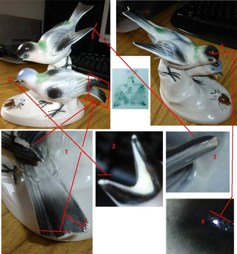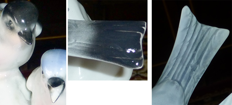 махонький скол кончика клюва; 3) У второй - скол кончика крыла