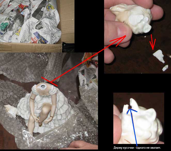 при пересылке. Отбита голова, повреждена прическа. Одного кусочка не хватает.